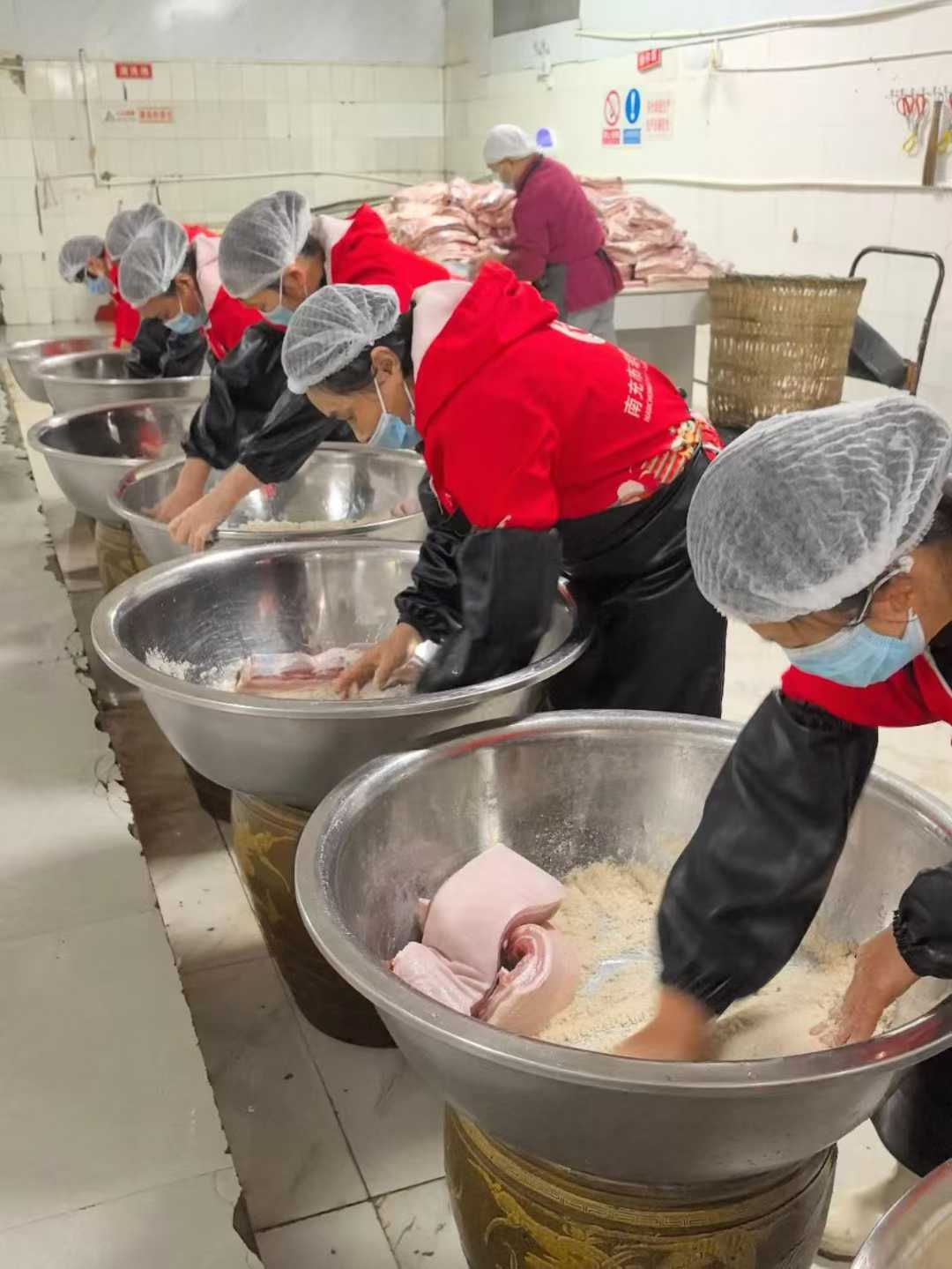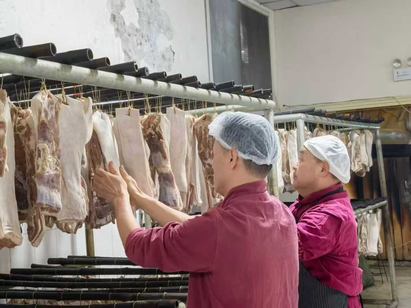 做藏香黑豬臘肉,我們還是守著老規(guī)矩來!精選豬五花、后腿肉這些好部位,用自貢井鹽搭配本地花椒、桂皮手工揉腌,腌夠7天再翻一次身,確保每一寸肉都吸滿香料味。之后掛起來曬足山風(fēng)日曬,最后進(jìn)烘房用松柏、橘皮文火慢熏20多個(gè)小時(shí),沒有任何添加劑,全靠時(shí)間和手藝沉淀出醇厚臘香。
